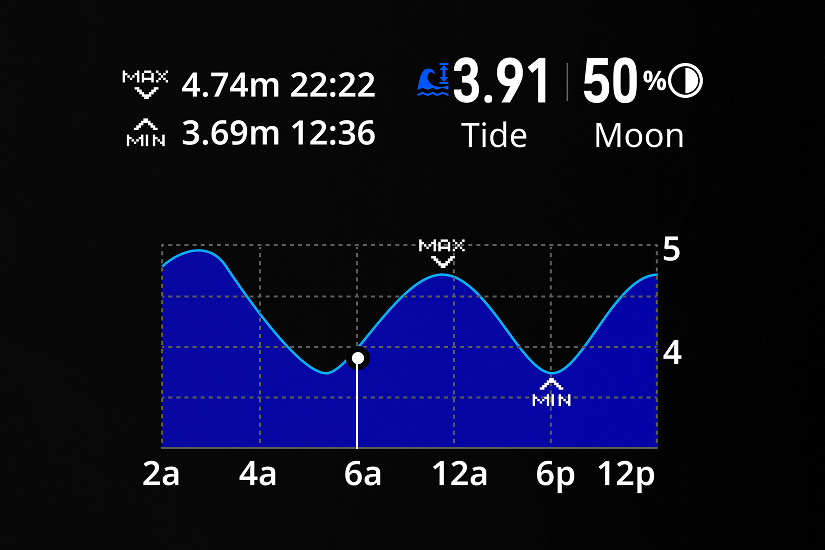 With its features dedicated to time and environmental tracking, it allows quick access to tide schedules, helps anticipate changing conditions, and keeps focus on what matters most. Programmable alerts prevent surprises from sudden rising water, enhancing safety in the field.